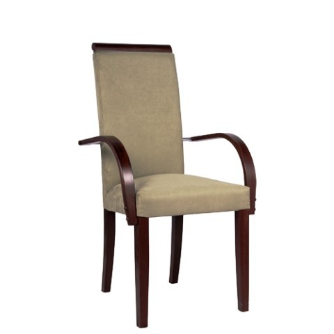 Sedia in legno imbottita con braccioli, rivestita in moltissimi colori e tessuti/pelli disponibili. Questa sedia trova un perfetto impiego in ristoranti e bar, ma è anche adatta per alberhi o eleganti sale d'attesa.
