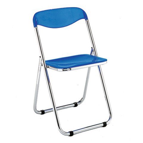 Sedia pieghevole con struttura in acciaio cromato. Sedile e schienale in plastica semitrasparente di colore Blu.