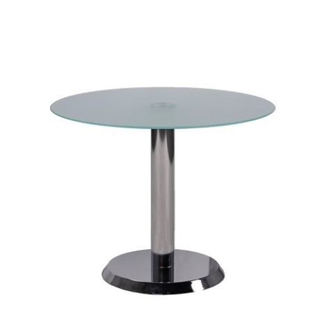 Tavolino basso da caffè con base rotonda in acciaio INOX e con top in vetro satinato. Un tavolo per ristoranti di altezza 60,00 cm ideato per essere utilizzato come tavolino basso in zone lounge e relax.
